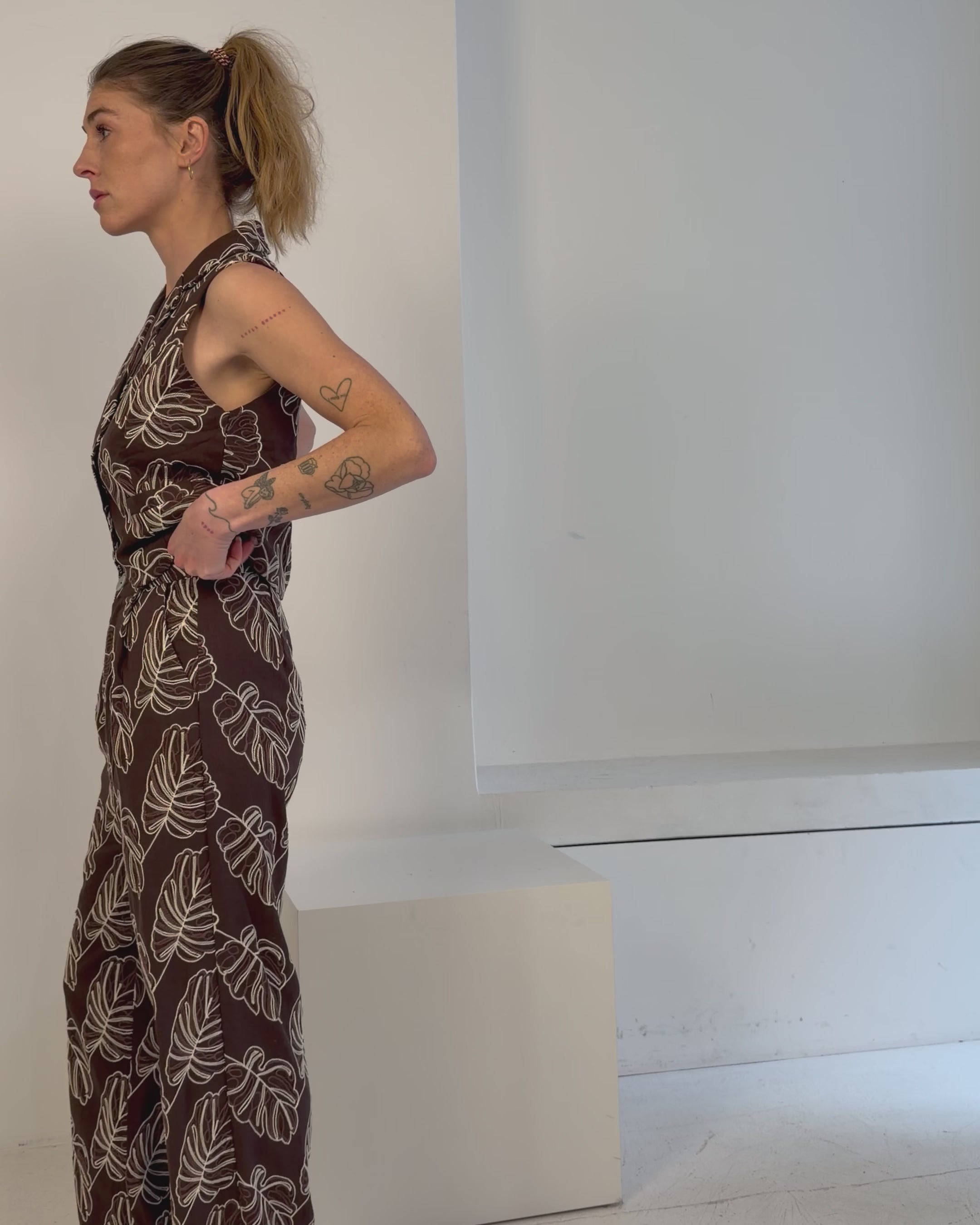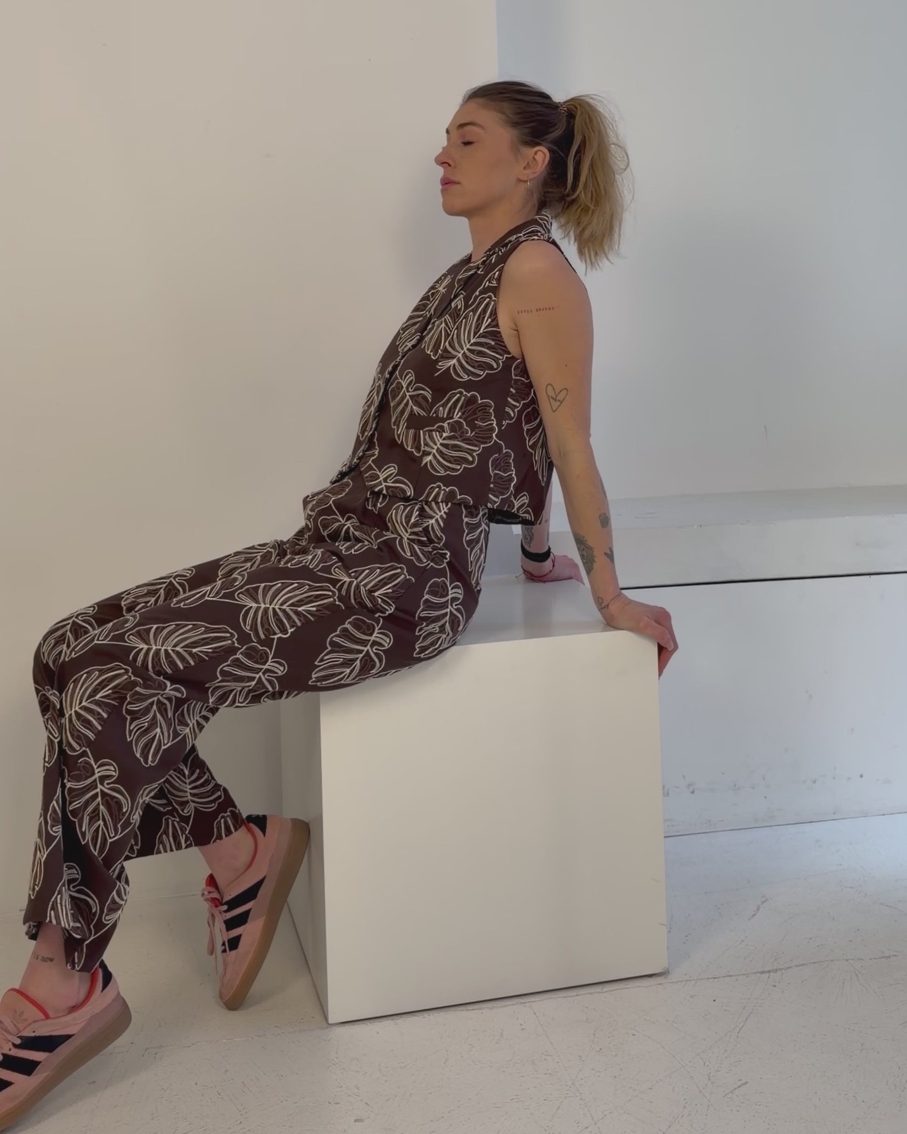 Erlebe mit unserem gemusterten Zweiteiler einen Hauch von Eleganz! Das bestickte Gilet ist locker und lässig geschnitten und bietet Komfort und Stil. Die Hose mit geradem Bein und leichten Bundfalten ergänzt das Ensemble perfekt.